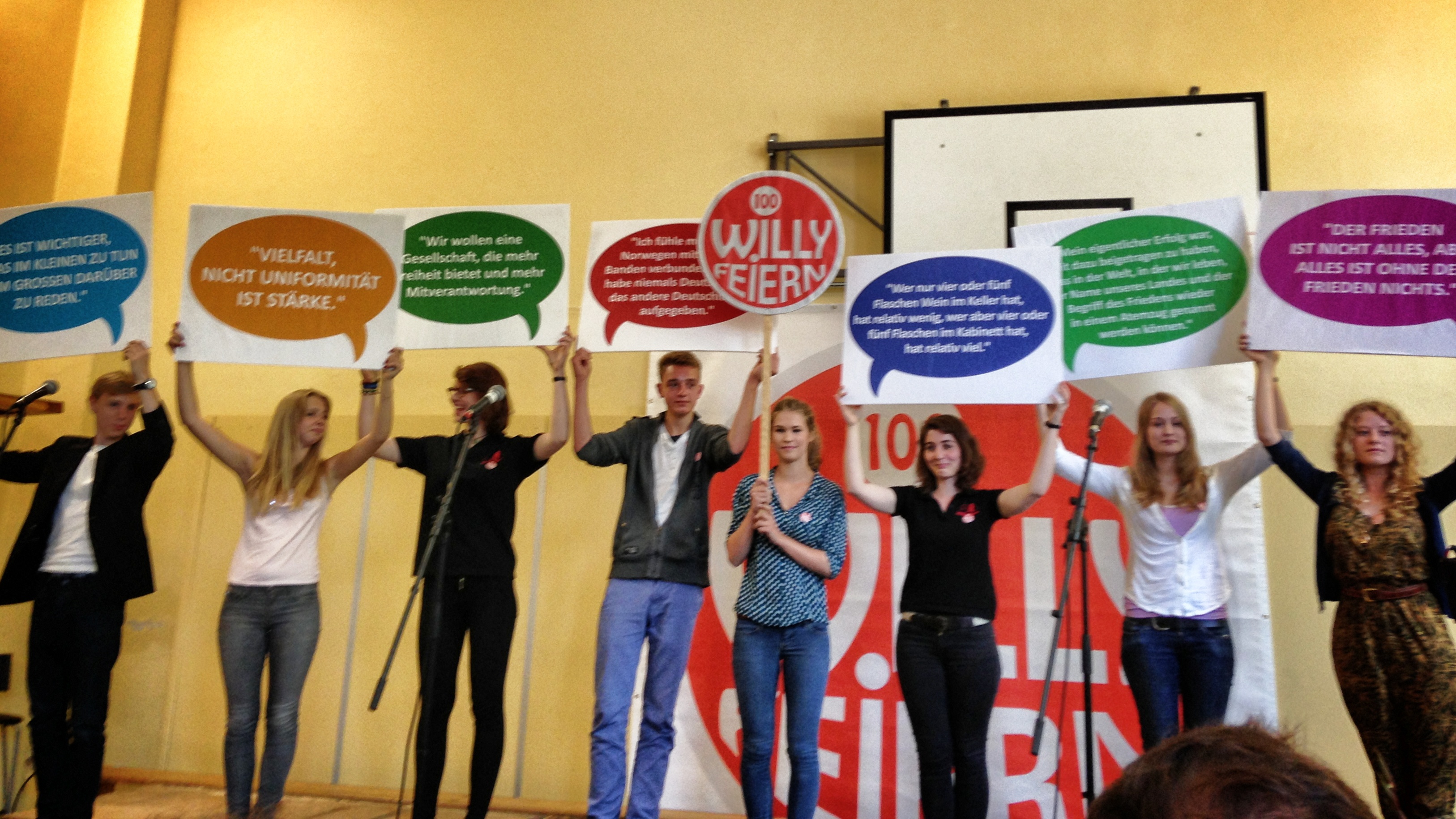 Here are high school students from Johanneum zu Lübeck presenting on Willy Brandt, a German statesman and politician, leader of the Social Democratic Party of Germany from 1964 to 1987 and chancellor of the Federal Republic of Germany from 1969 to 1974. He was born in Lübeck and was active in politics at a very early age. Good history here and ultimately, he won the Nobel Peace Prize for his efforts to forge positive relations between West Germany and the Soviet bloc.