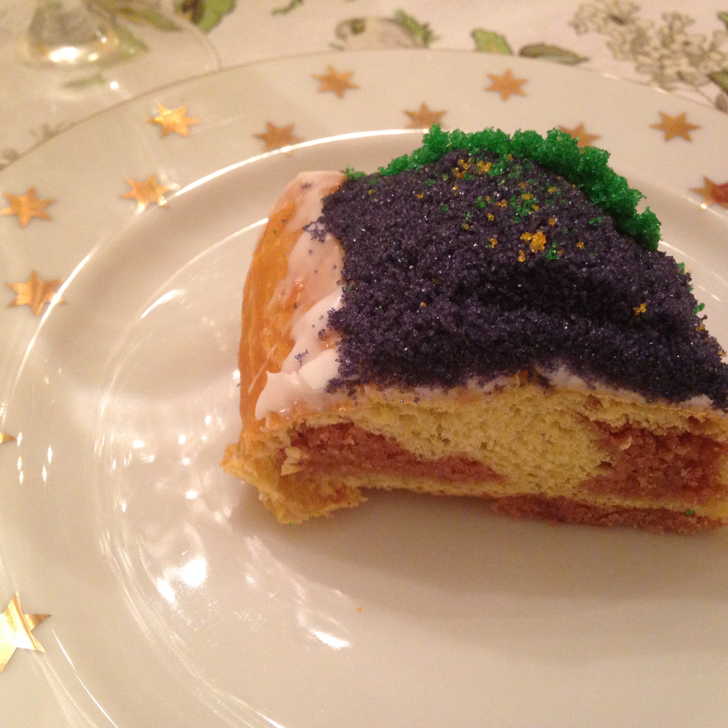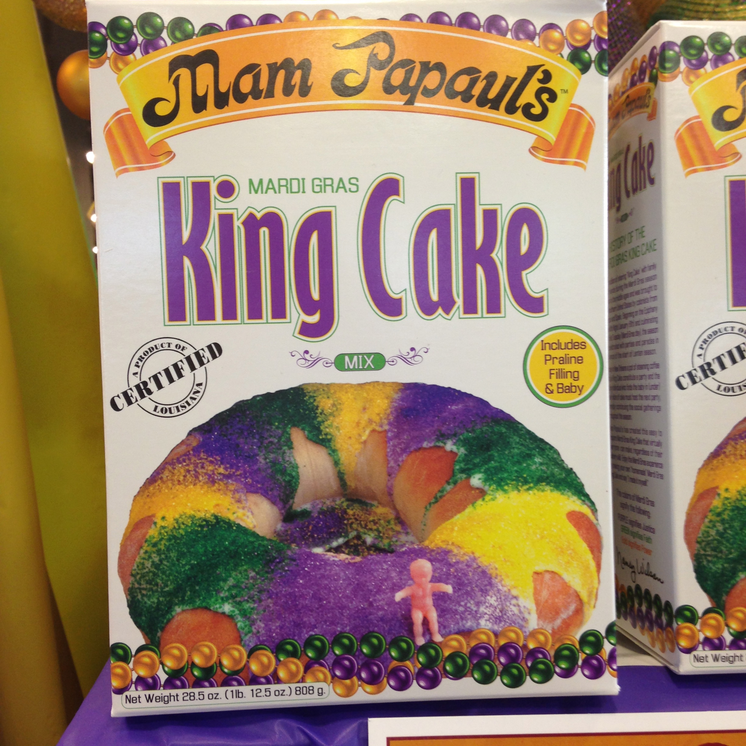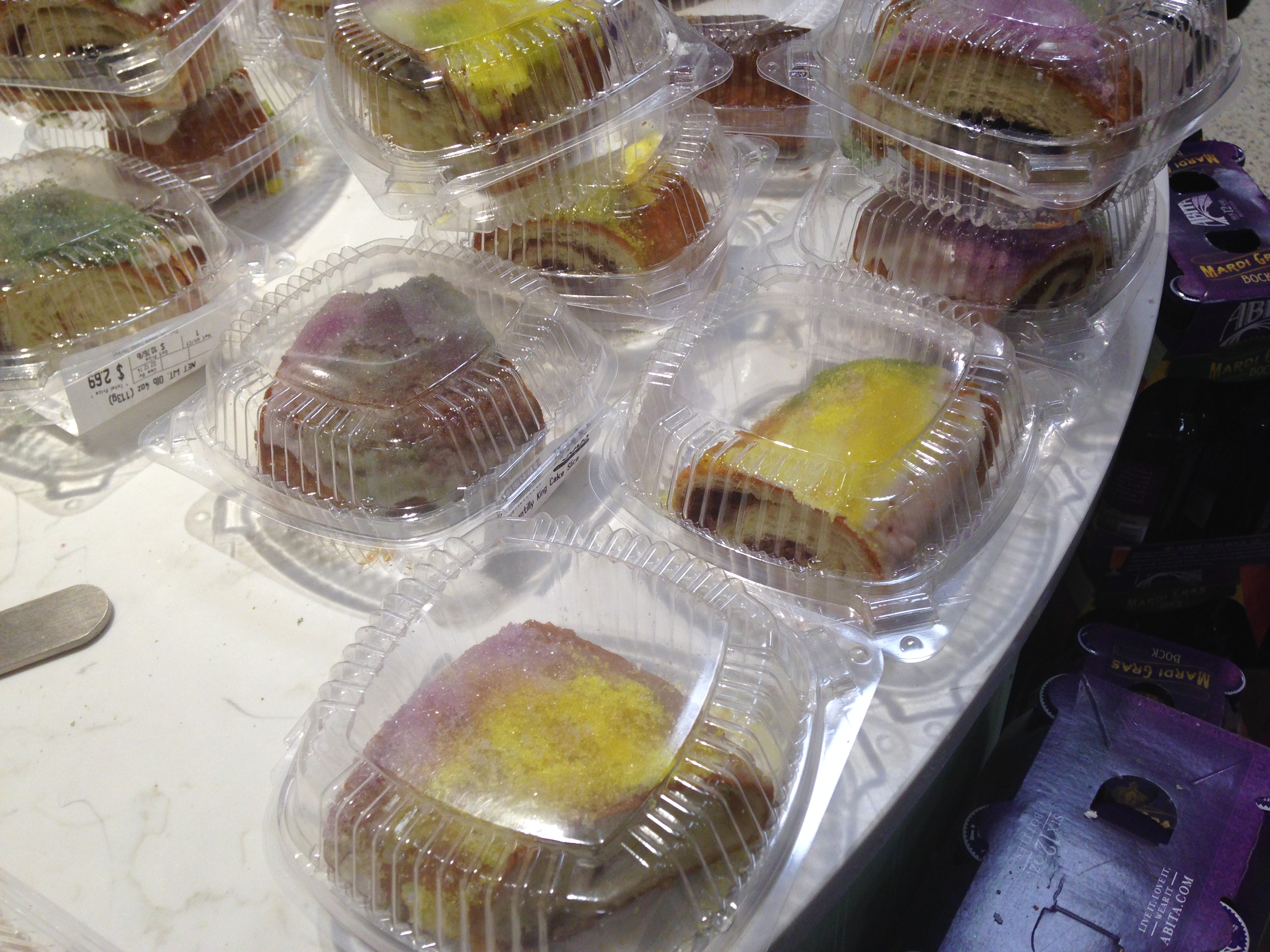 What’s a king cake? A king cake is a seasonal bakery item (can be a cupcake, usually looks like a wreathed bread, mostly adorned with purple, gold and green icing, sugar and sprinkles) that symbolizes the festive period between the Epiphany (also known as the Twelfth Night) and Fat Tuesday (aka Mardi Gras). After Mardi Gras comes Ash Wednesday and 40 days of good behavior plus no meat on Fridays, if you subscribe to the Judeo-Christian canon. King cakes originally came with a bean baked inside to symbolize the king’s favor and/or privilege. Sometime in the mid-20th century, a grocer substituted a plastic baby for the bean and the move stuck.